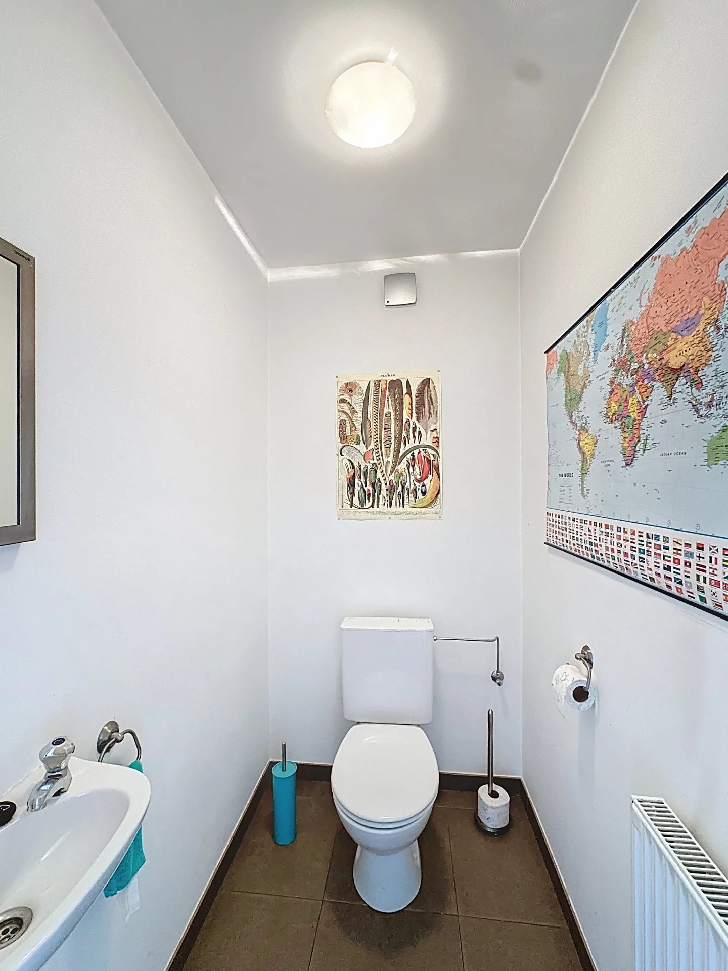 De badkamer is ruim, voorzien van douche en wasmeubel en aansluitingen voor wasmachine en droger.