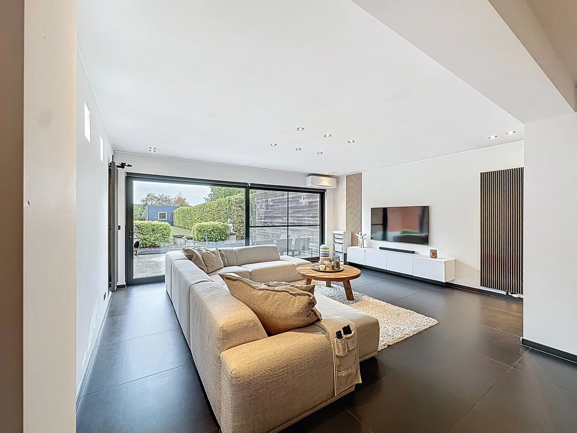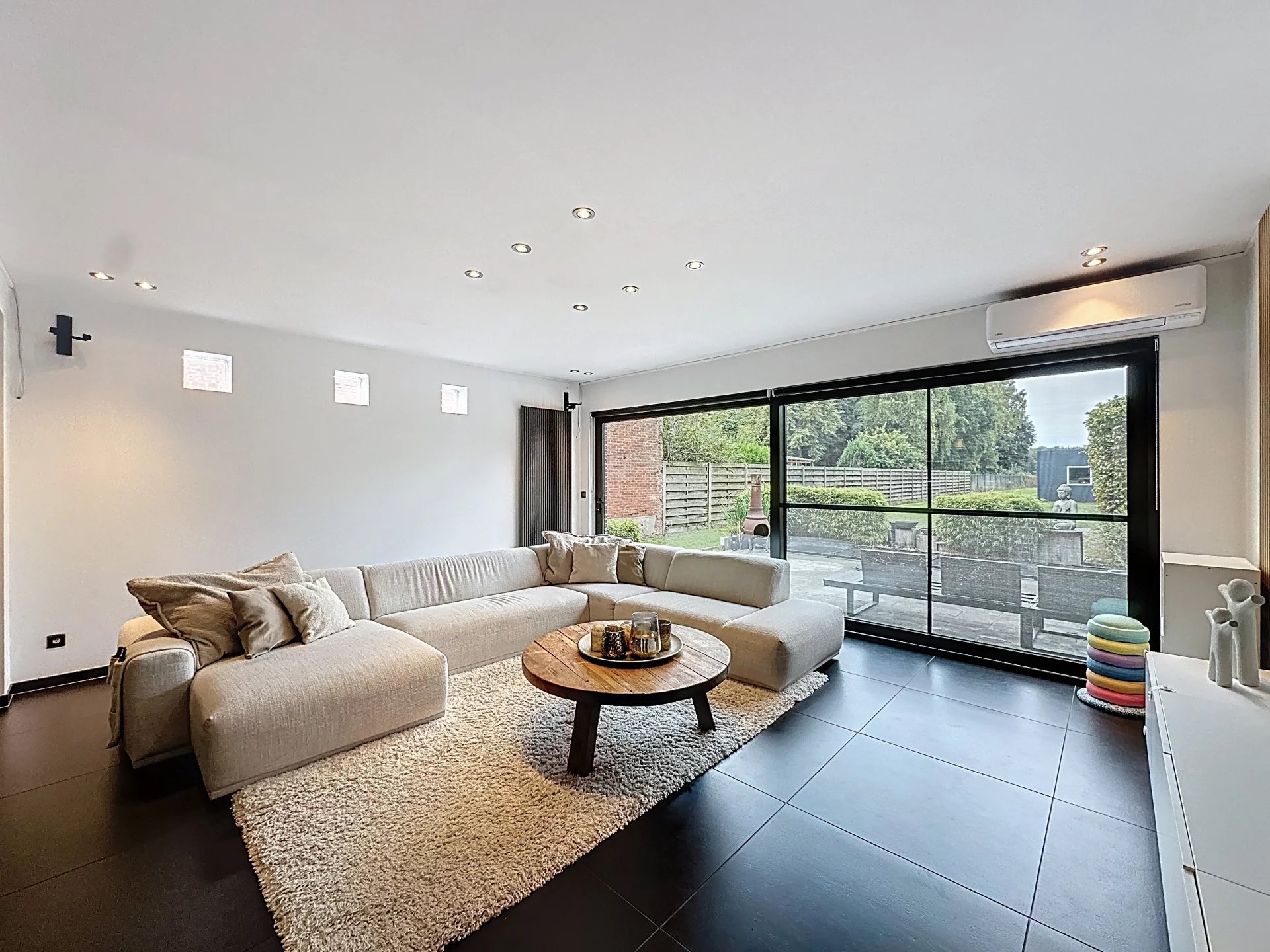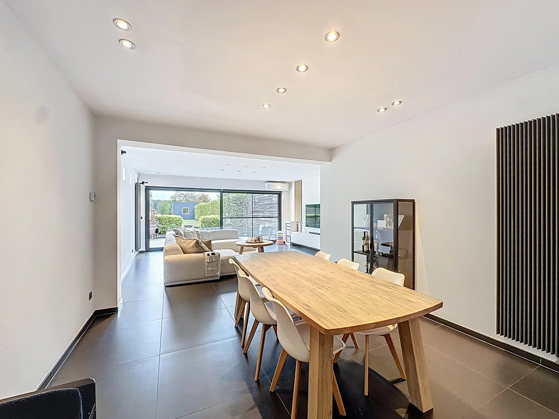 Het eet- en leefgedeelte is een lange open ruimte waarbij je door het grote schuifraam zicht hebt op de prachtige tuin.