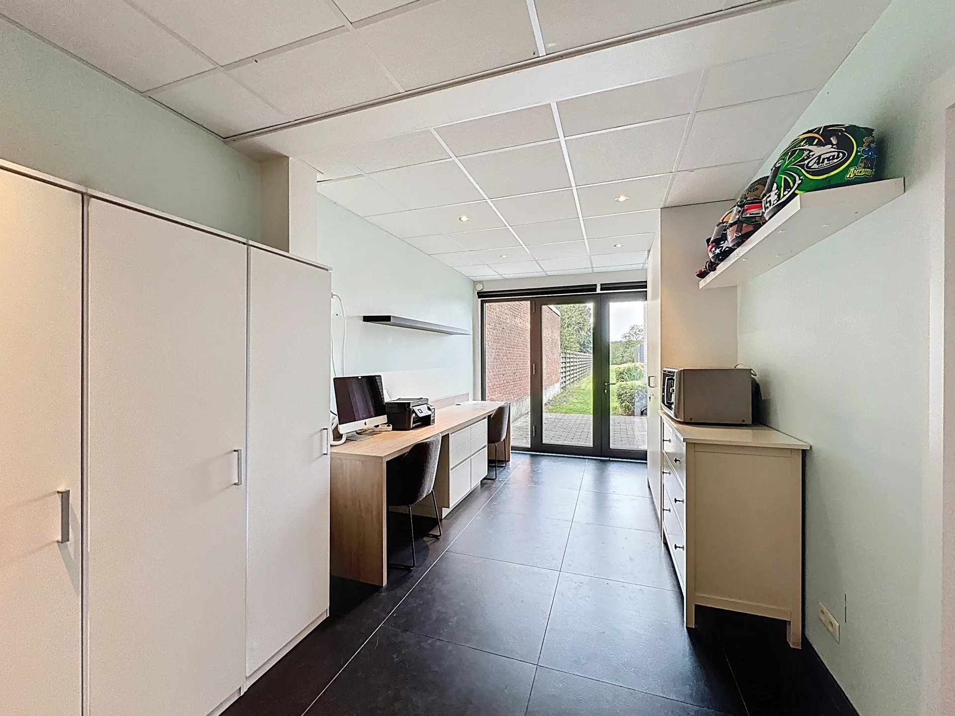 De garage werd omgebouwd tot een praktische kantoorruimte en heeft voor- en achteraan een aparte toegang.