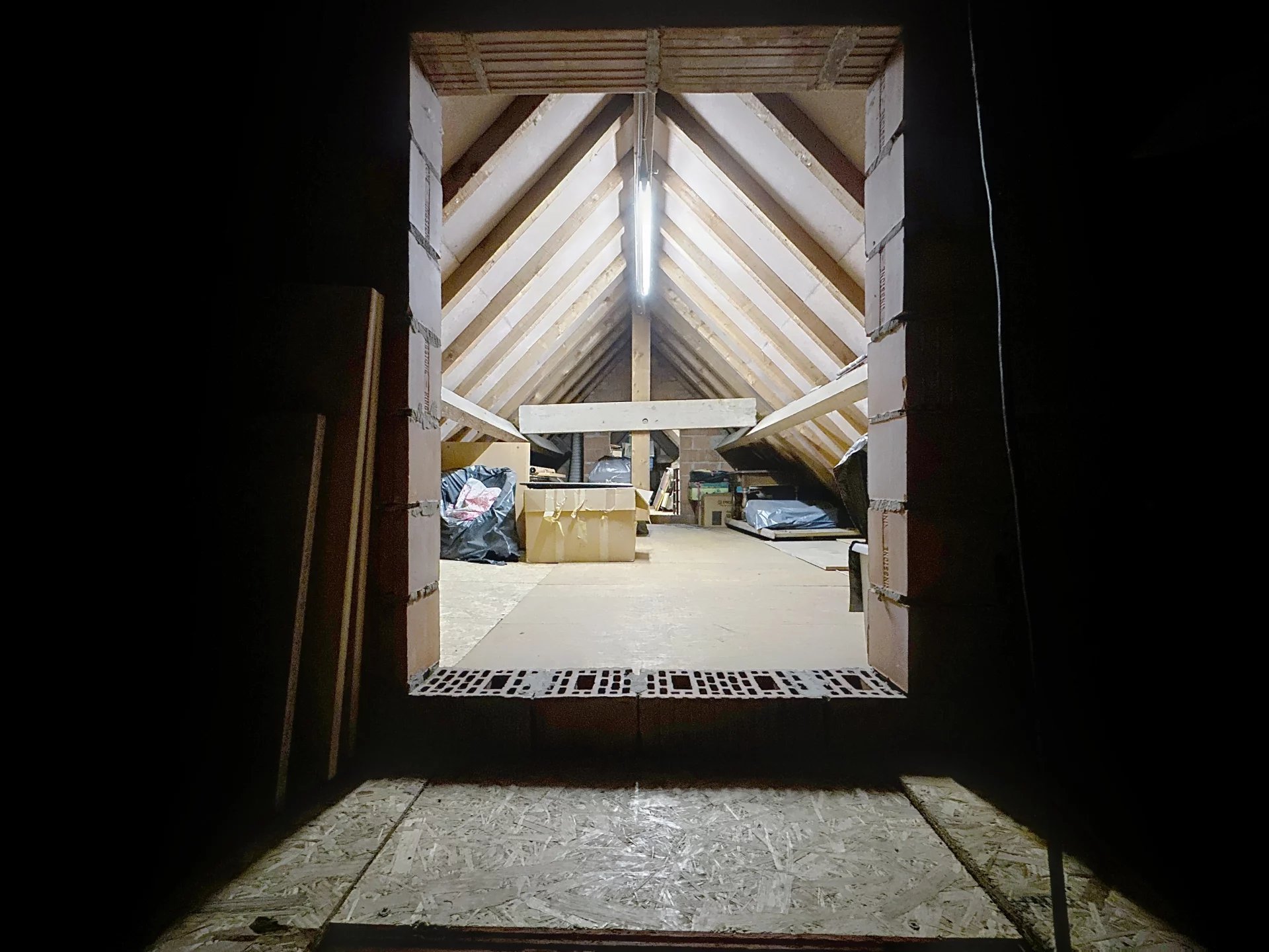 Via de grote slaapkamer is er toegang tot de zolder. Deze loopt over de gehele lengte van de woning wat voor zeer veel extra stockagemogelijkheid zorgt.